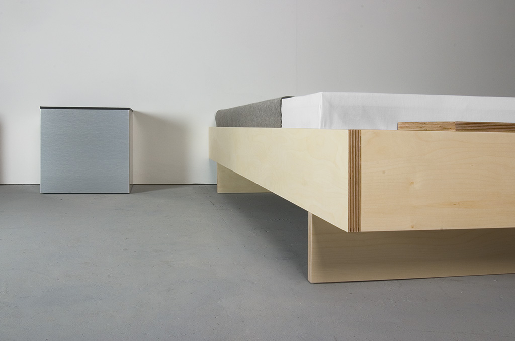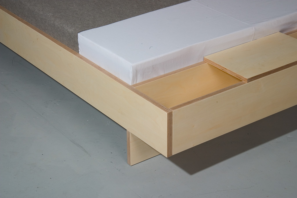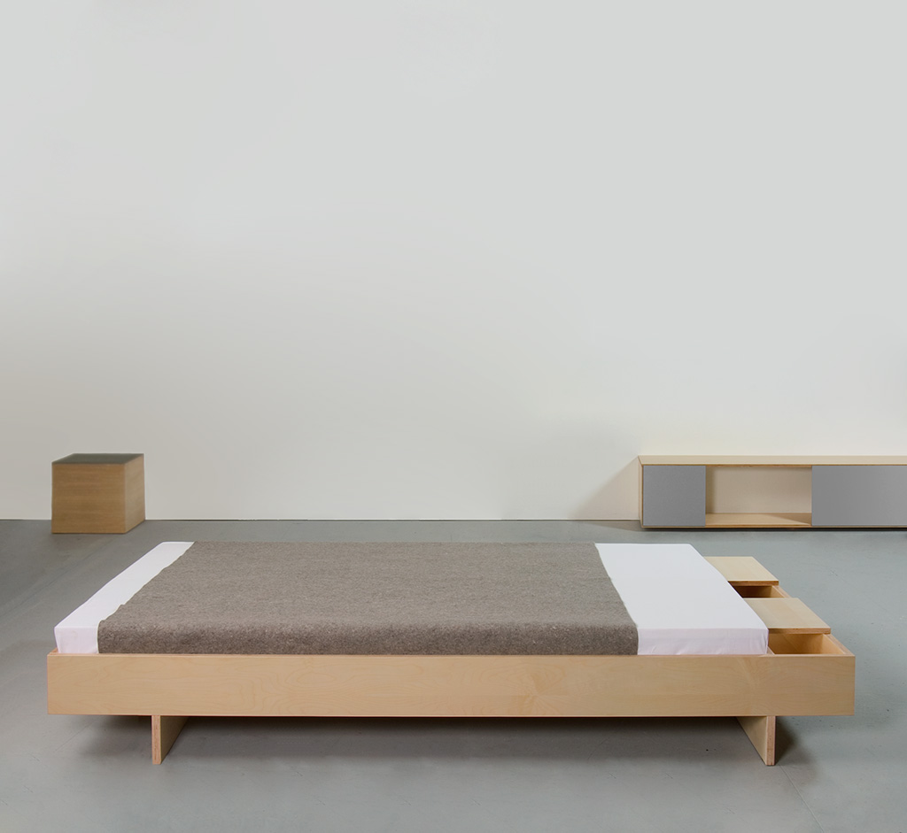 bed, in solid wood or multiplex. bezwei is available in three versions: as a bed frame with indented partitions, with one front storage compartment or with two front storage compartments. two sliding shelves partially close the compartments. the storage compartment can be completely closed off with an optional third cover.