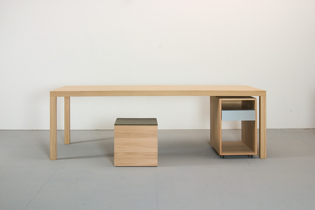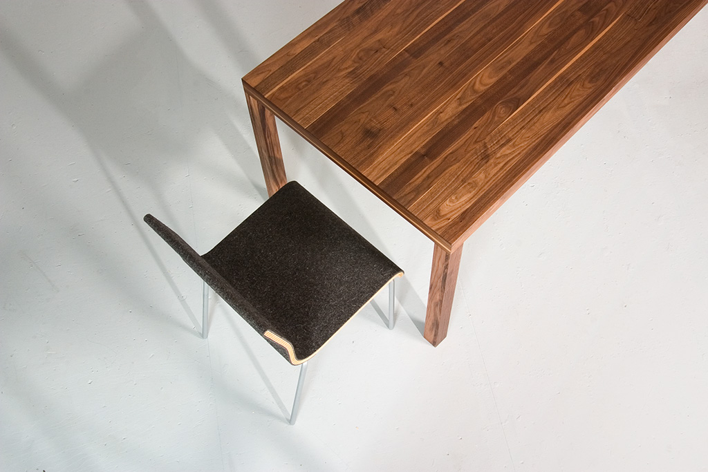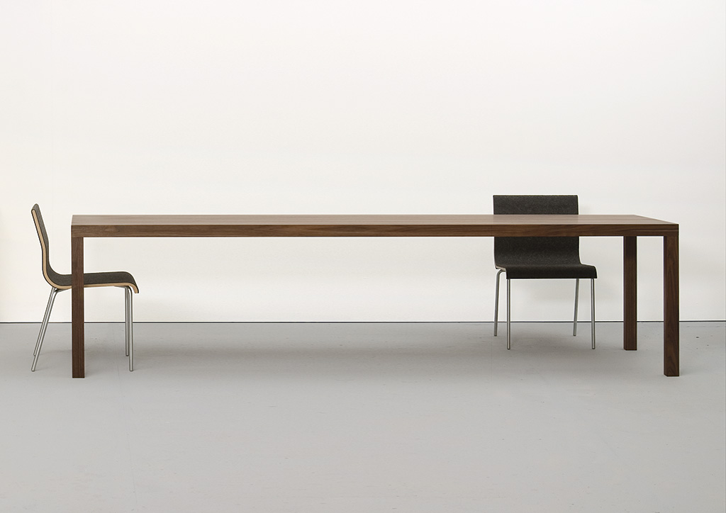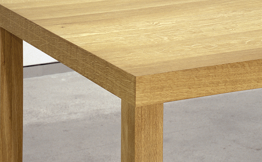 table. solid wood or steel. table and legs have the same measure of 6 cm. the table top consists of three layers of solid wood. the legs are detachable. on request the table could be delivered in one piece with permanently fixed legs (seamless).