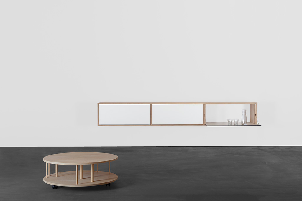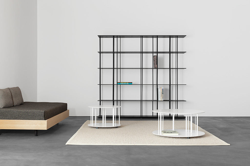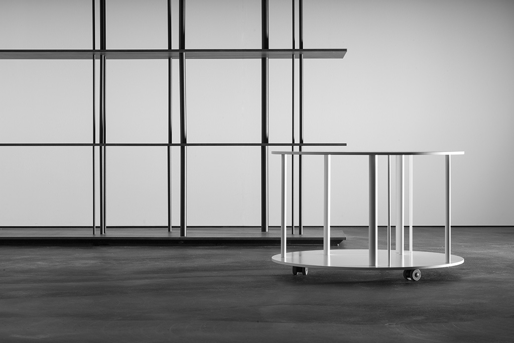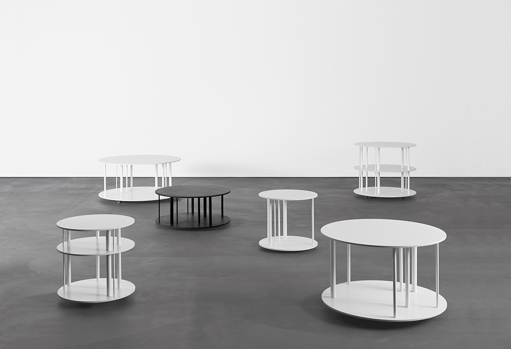 sidetable. hpl black and white or solid wood in oak and nut, aluminium or wooden poles. either rollers or feet. pi is serial and unique. arrangement and diameter of the poles between the levels is configured by random principle. every pi is different. the sidetable is available in three diameters and four different heights of storeys.