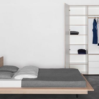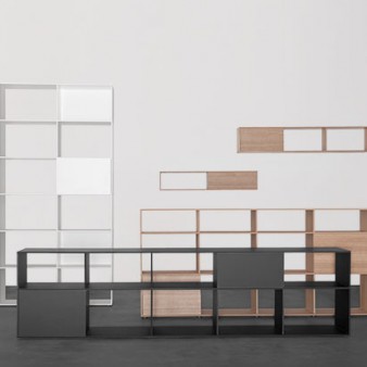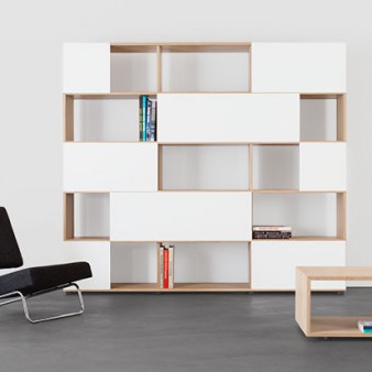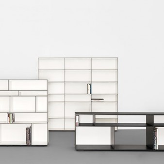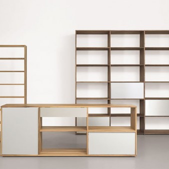modulares schrank- und stauraummöbelsystem auf mass materialstärke einheitlich 12mm. optional als raumteiler und mit frontalen oder seitlich offenen fächern. schlanke seitenwände mit griffaussparungen rhythmisieren die fronten und bestimmen die zurückhaltende erscheinung. die inneneinteilung ist frei planbar. drehtüren, kleiderstangen, schub-läden und variable fächer lassen sich indiviuell...