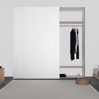 modulares schrank- und stauraummöbelsystem auf mass materialstärke einheitlich 12mm. optional als raumteiler und mit frontalen oder seitlich offenen fächern. schlanke seitenwände mit griffaussparungen rhythmisieren die fronten und bestimmen die zurückhaltende erscheinung. die inneneinteilung ist frei planbar. drehtüren, kleiderstangen, schub-läden und variable fächer lassen sich indiviuell...
