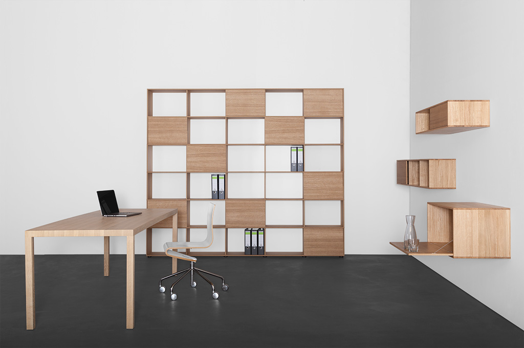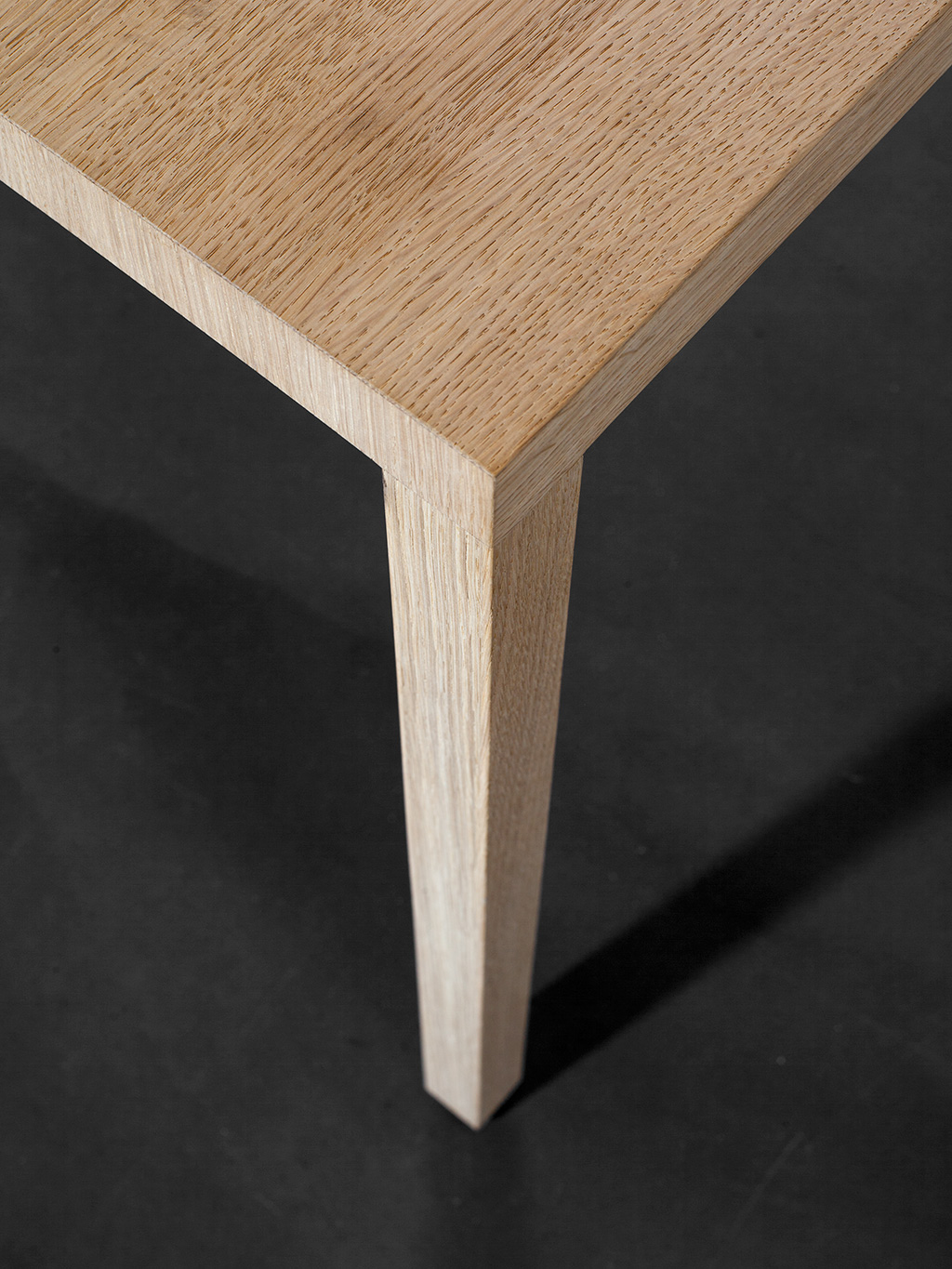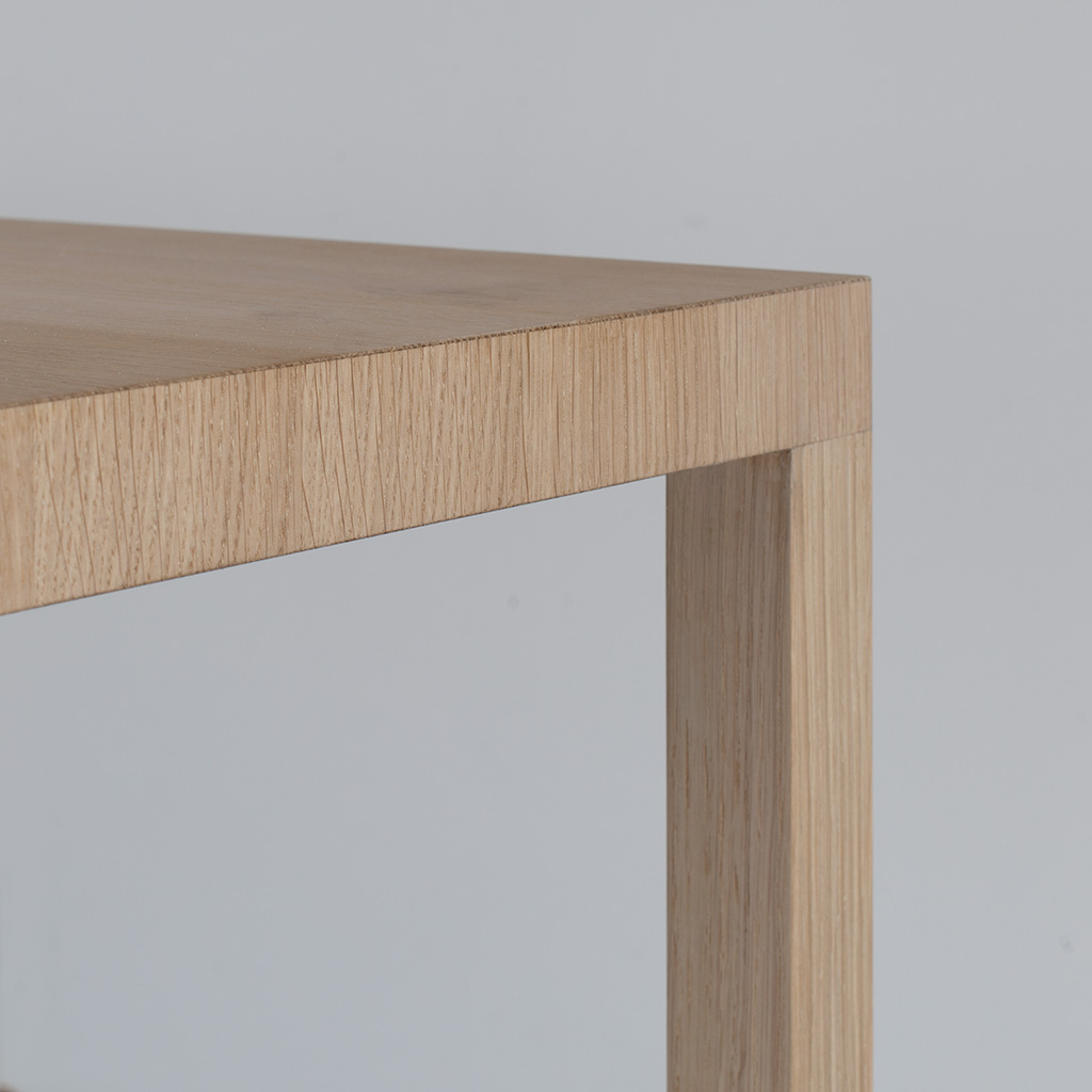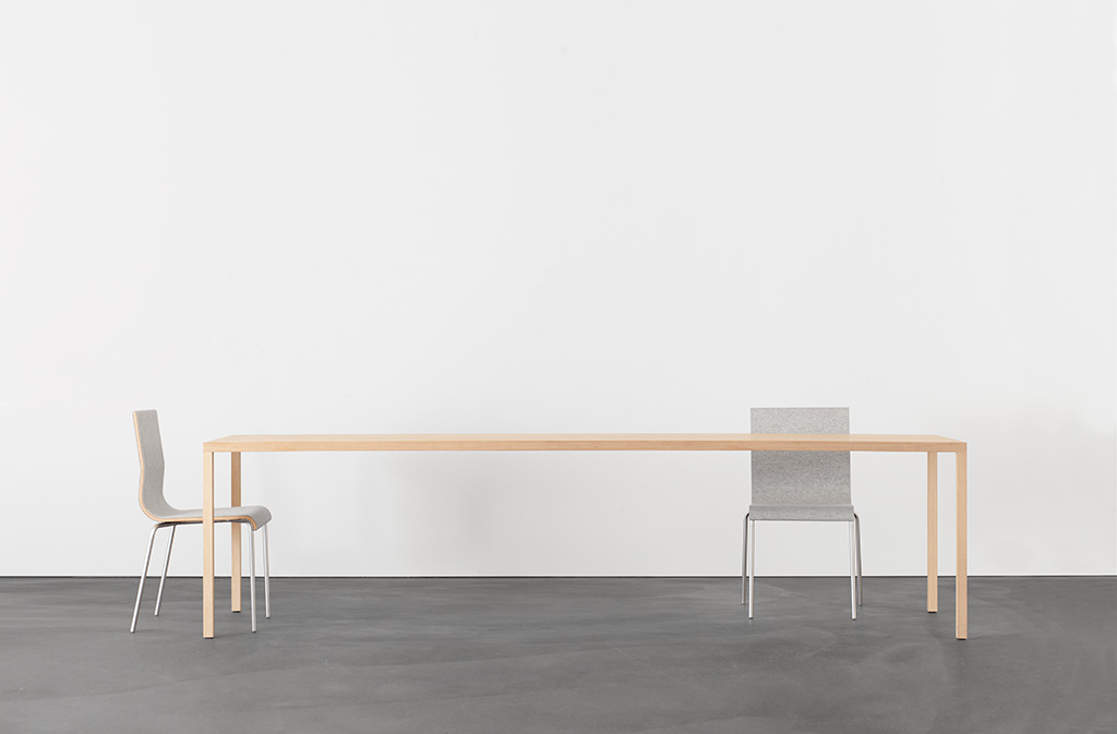 tisch, massivholz oder stahl. tischebene und bein sind mit einer identischen ansichtsbreite von 3,6 cm ausgeführt. die tischplatte besteht aus drei massiven holzschichten. die tischecke ist innenliegend mit stahl verstärkt. din36 wird mit fugenlos montierten beinen ausgeführt.
