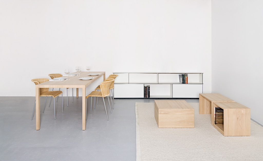 tisch, massivholz oder stahl. platte und bein sind mit einer identischen ansichtsbreite von 4,6 cm ausgeführt. die tischplatte besteht aus drei massiven holzschichten. die tischecke ist innenliegend mit stahl verstärkt. dinanull wird mit fugenlos montierten beinen ausgeführt.