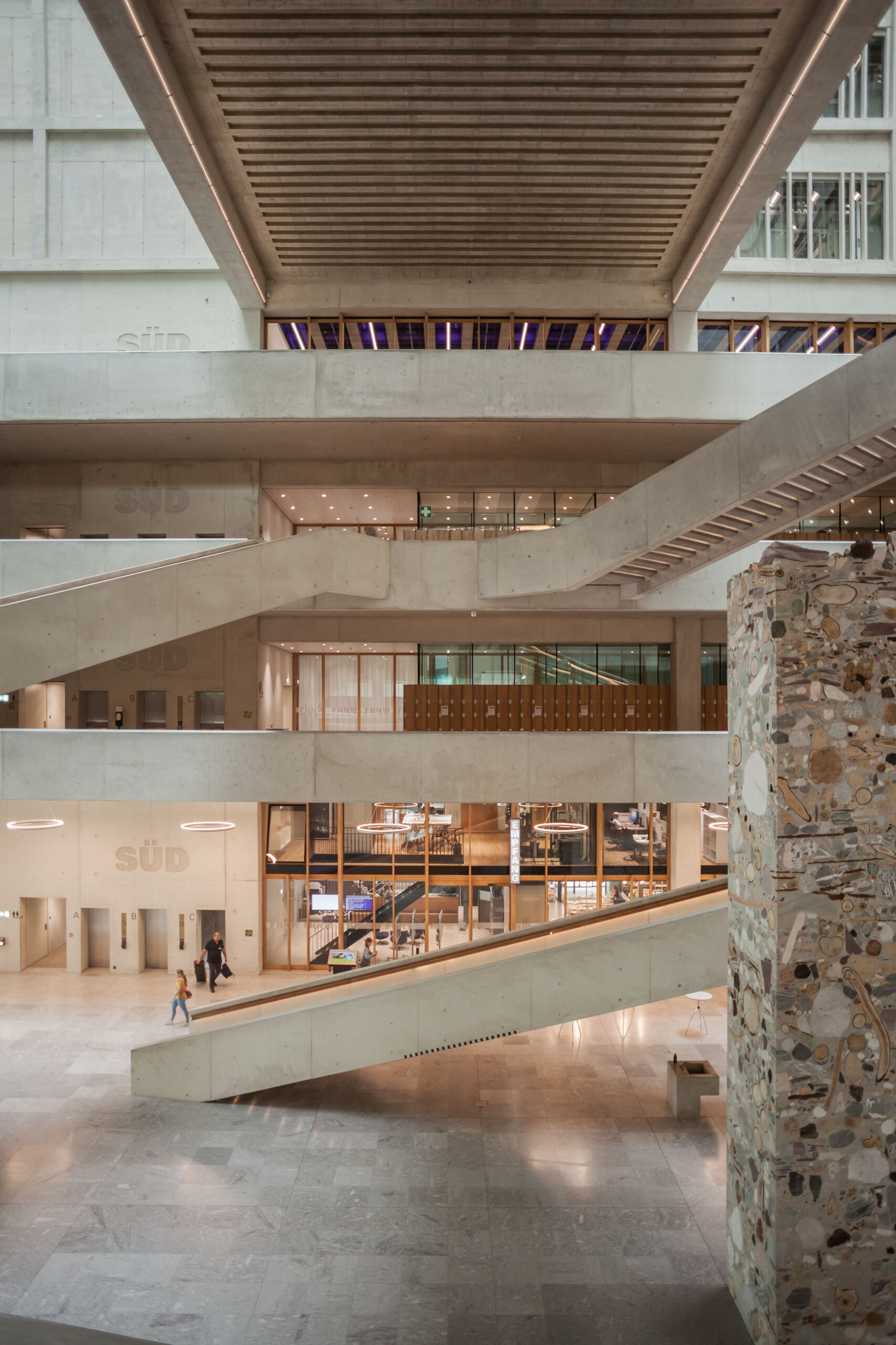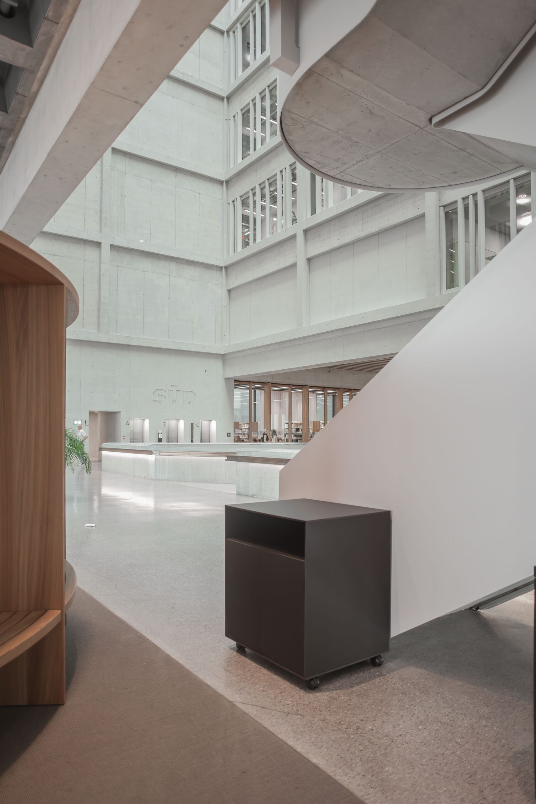 fachhochschule nordwestschweiz, muttenz (bl), schweiz, 2018. von außen zeigt sich das imposante und preisgekrönte gebäude als hochhaus, von innen als vielgestaltiges hofhaus. der eindrucksvolle, mehrgeschossige atriumraum wird von mehreren markanten, raumdiagonalen treppenläufen durchzogen. sie stellen eine zügige verbindung zwischen den einzelnen funktionsbereichen her und vermitteln beim durchschreiten des hofvolumens ein eindrückliches raumerlebnis. architektur: pool architekten, zürich. ausstattung aller service- und copybereiche mit ca. 50 stk tektur.