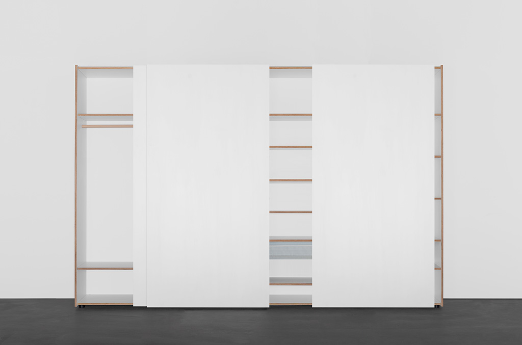 schranksystem auf mass. multiplex hpl-beschichtet weiss mit geölter sichtkante, eiche oder tanne dreischicht-massiv natur (zirbenholz +15%), materialstärke 20 mm. schrankbreite in einem stück maximal 308 cm. grössere schrankbreiten werden aus zwei korpi ausgeführt.