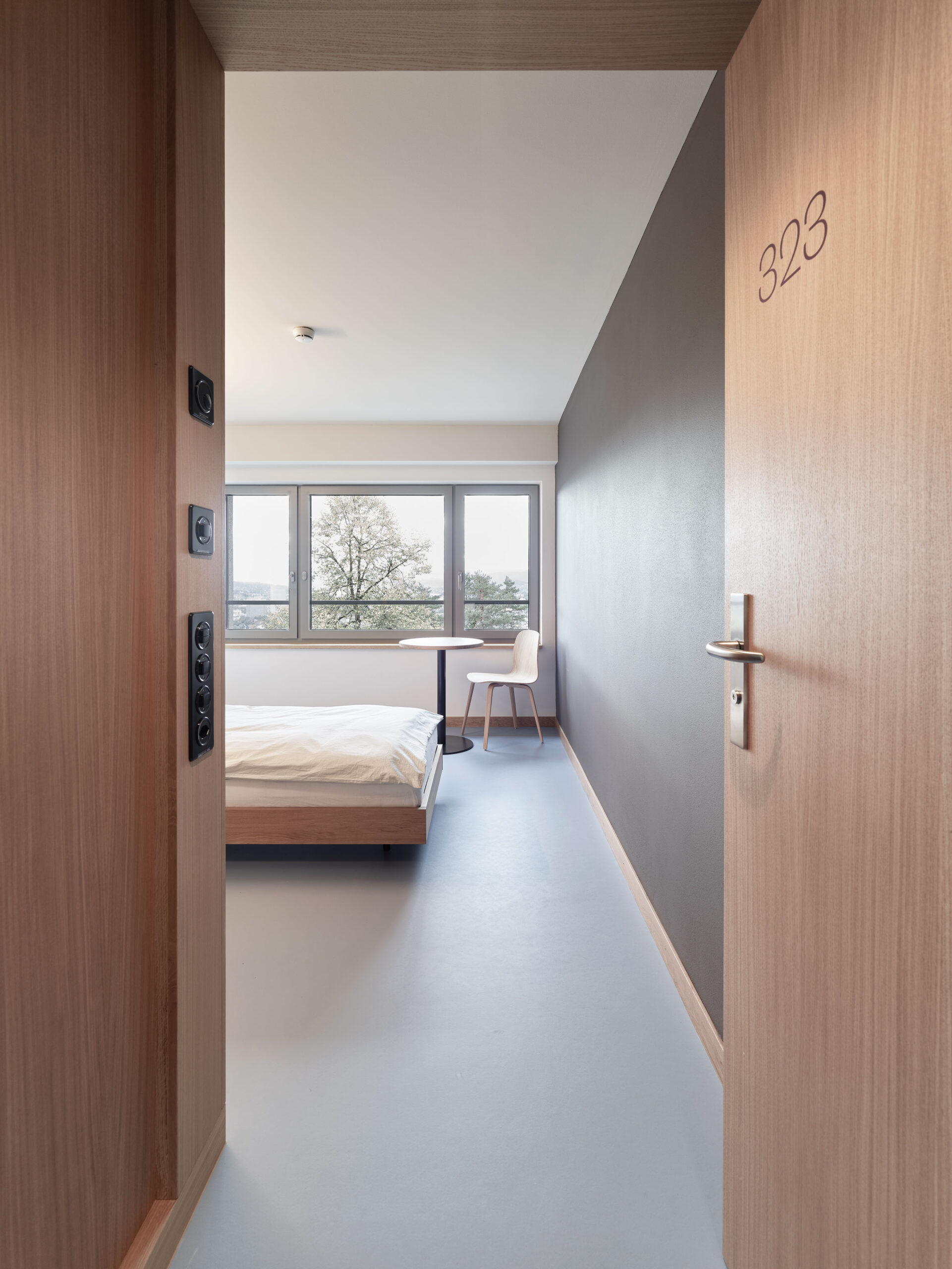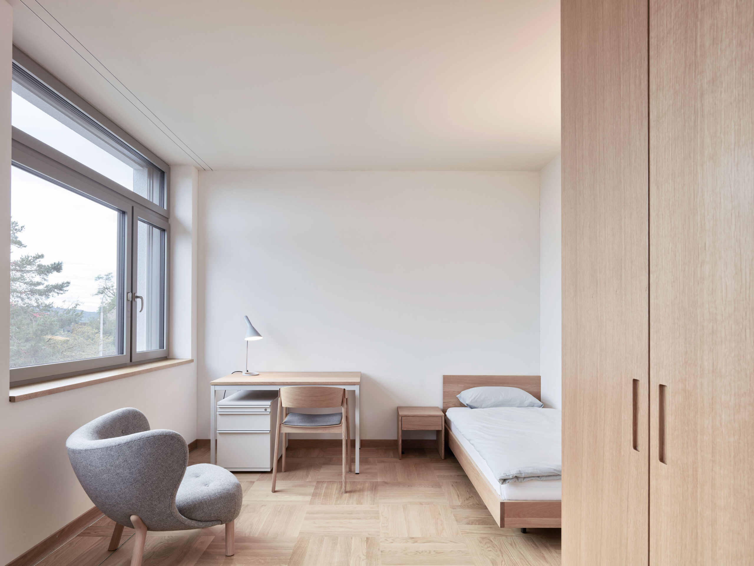 suchtfachklinik zürich, schweiz, 2019. instandsetzung und um-nutzung der suchtklinik der stadt zürich. die neu entstandenen innenräume zeichnen sich durch eine hohe aufenthaltsqualität aus und sind geprägt von natürlichem tageslicht und hochwertigen holz-möbeln. architektur: schneider gmür architekten, winterthur. iku 14h, relikt, vierbeintische, zentralfusstische.