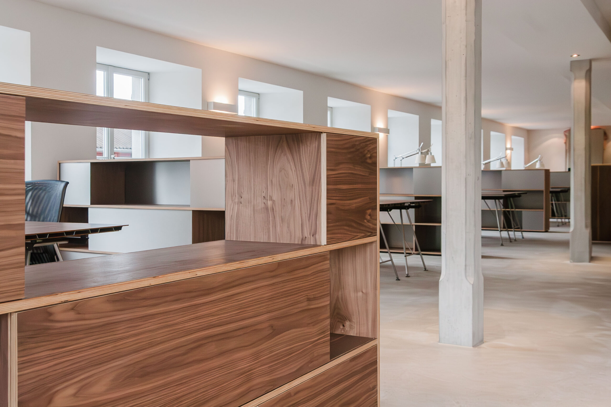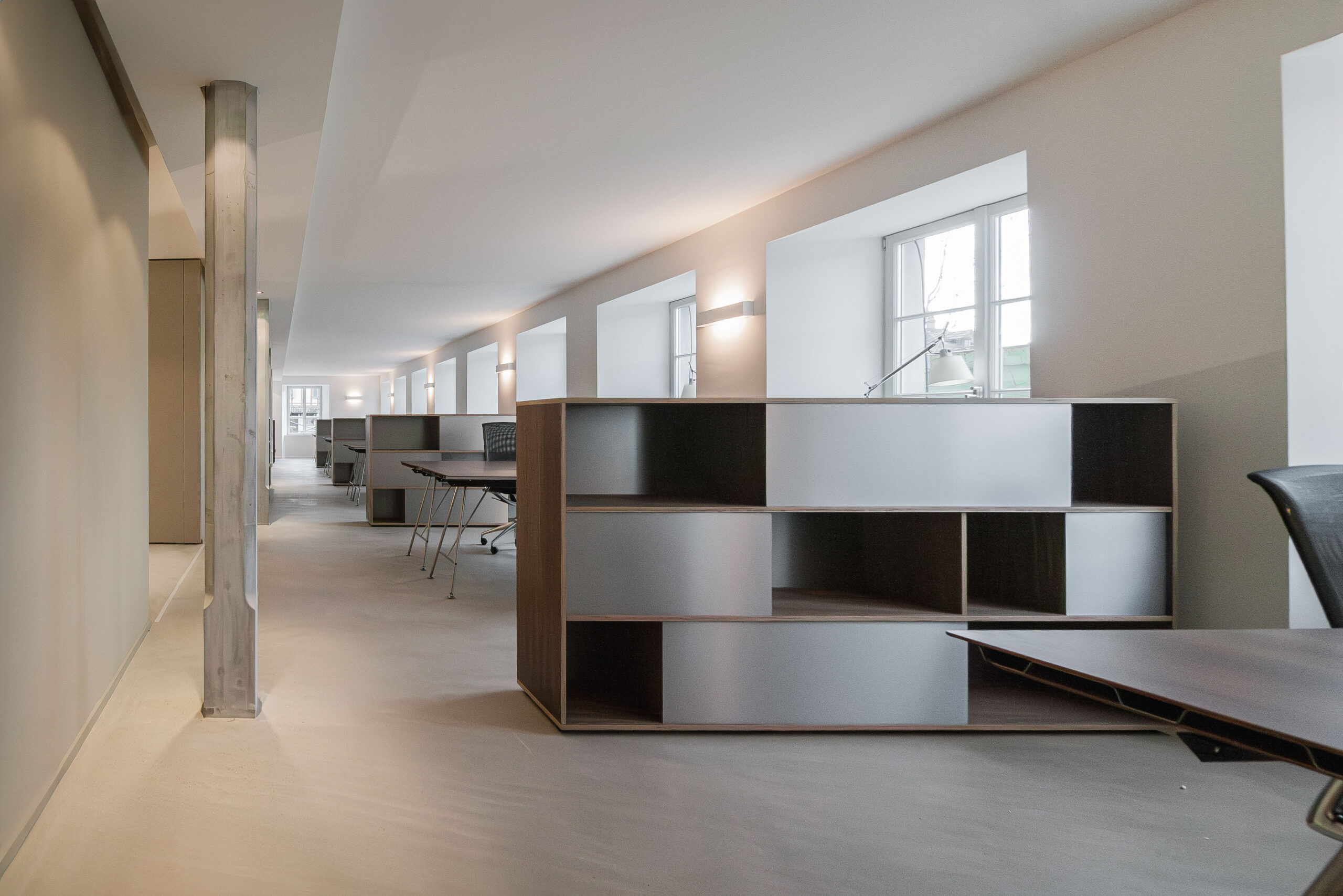 bürofläche, wallisellen (zh), schweiz, 2007. umbau eines gewerbegebäudes zu büroräumen. der rhythmus des bestehenden stützenrasters gibt bei der neuen nutzung den takt vor. so entstehen eine überzeugende und klare gliederung der arbeitsplätze und attraktive bereiche für küche und konferenzzone. die hellen oberflächen der bausubstanz und der warme nussbaum der möblierung bestimmen die räume. innenarchitektur: simona barborak, marthalen. produkte: analog
